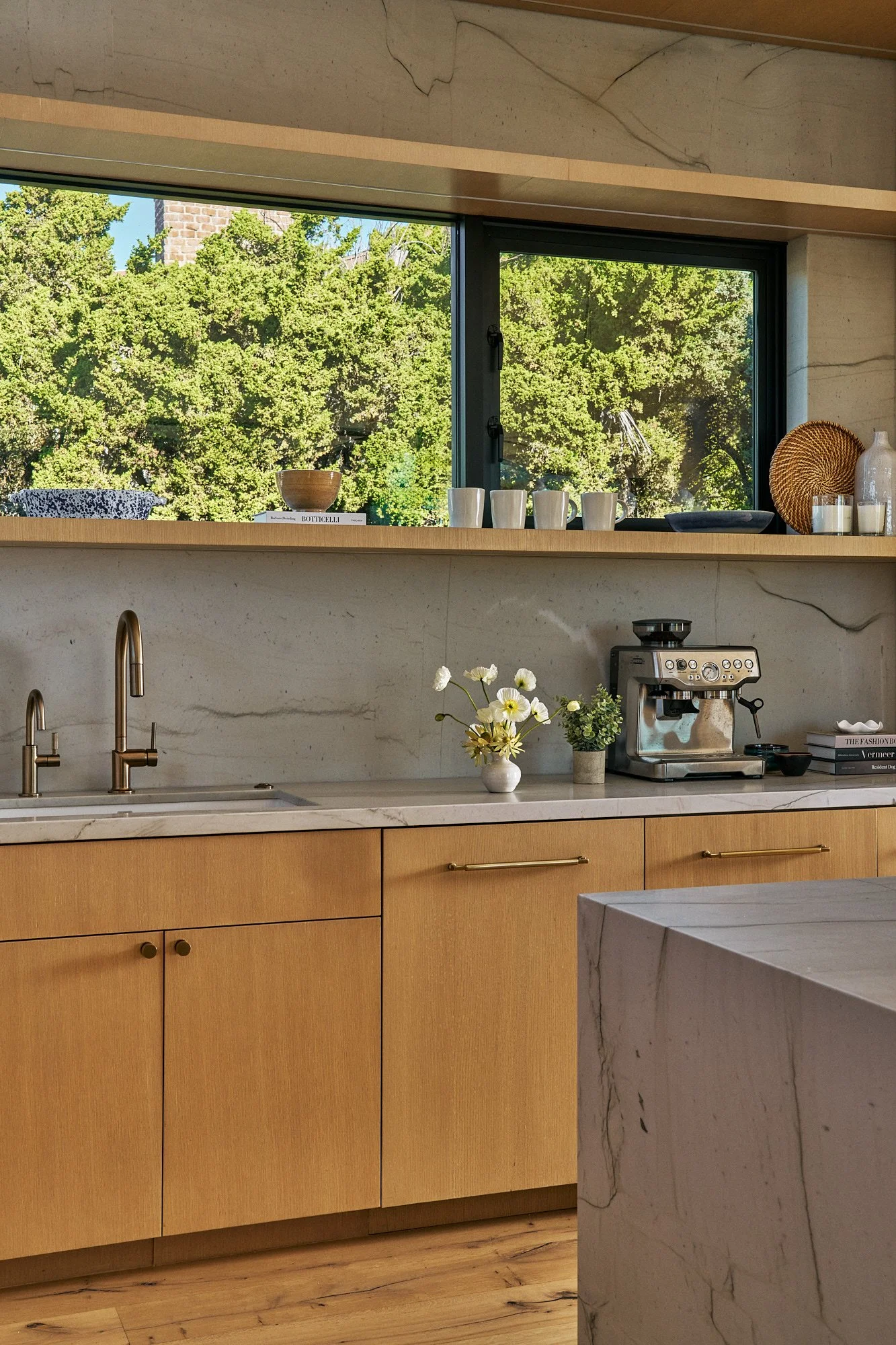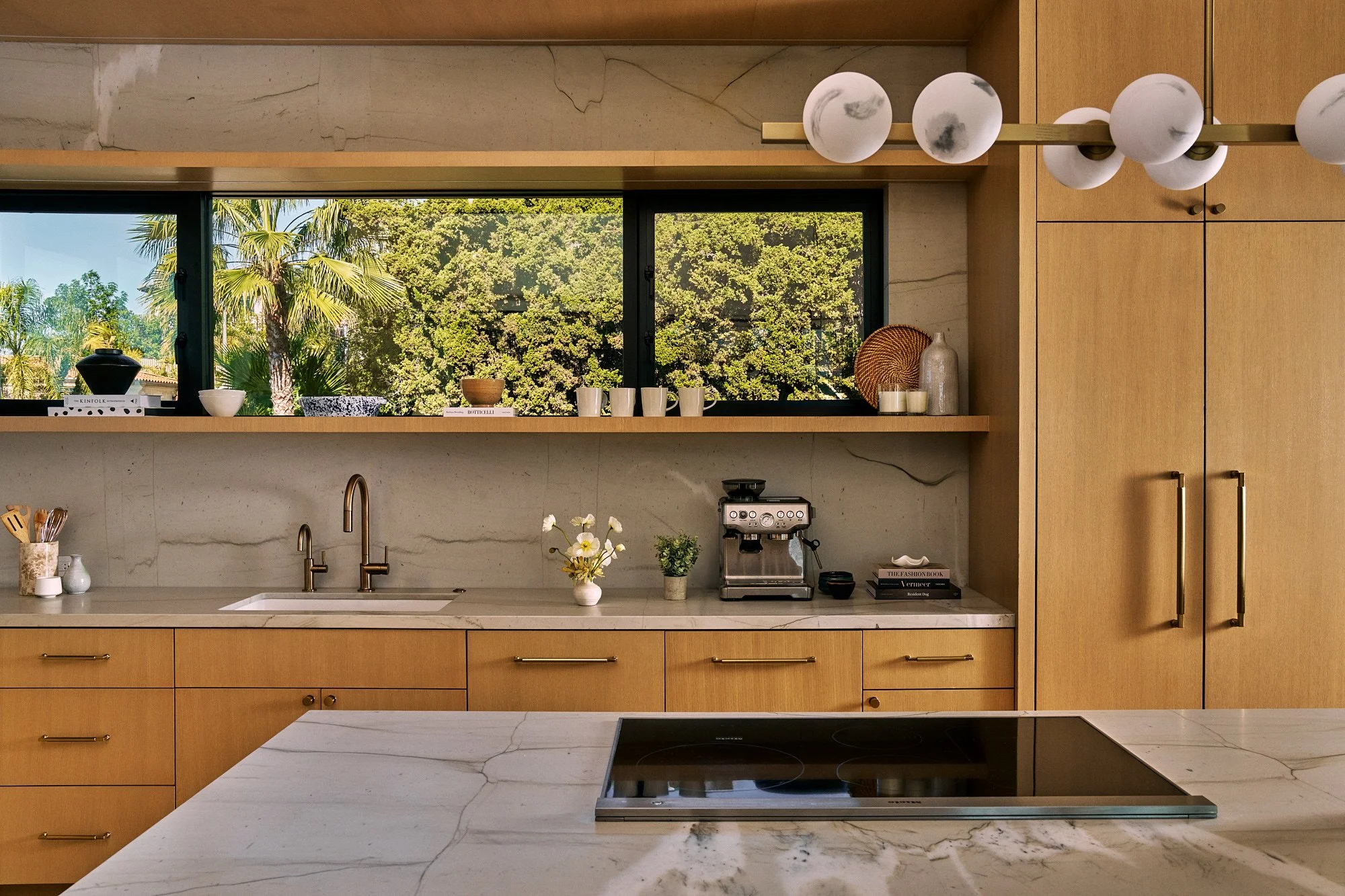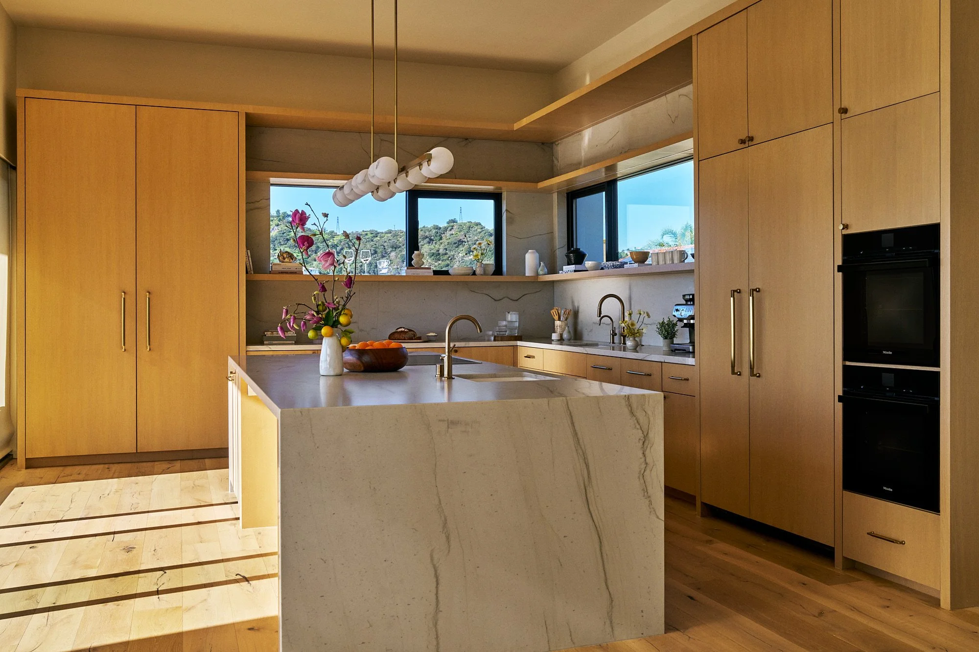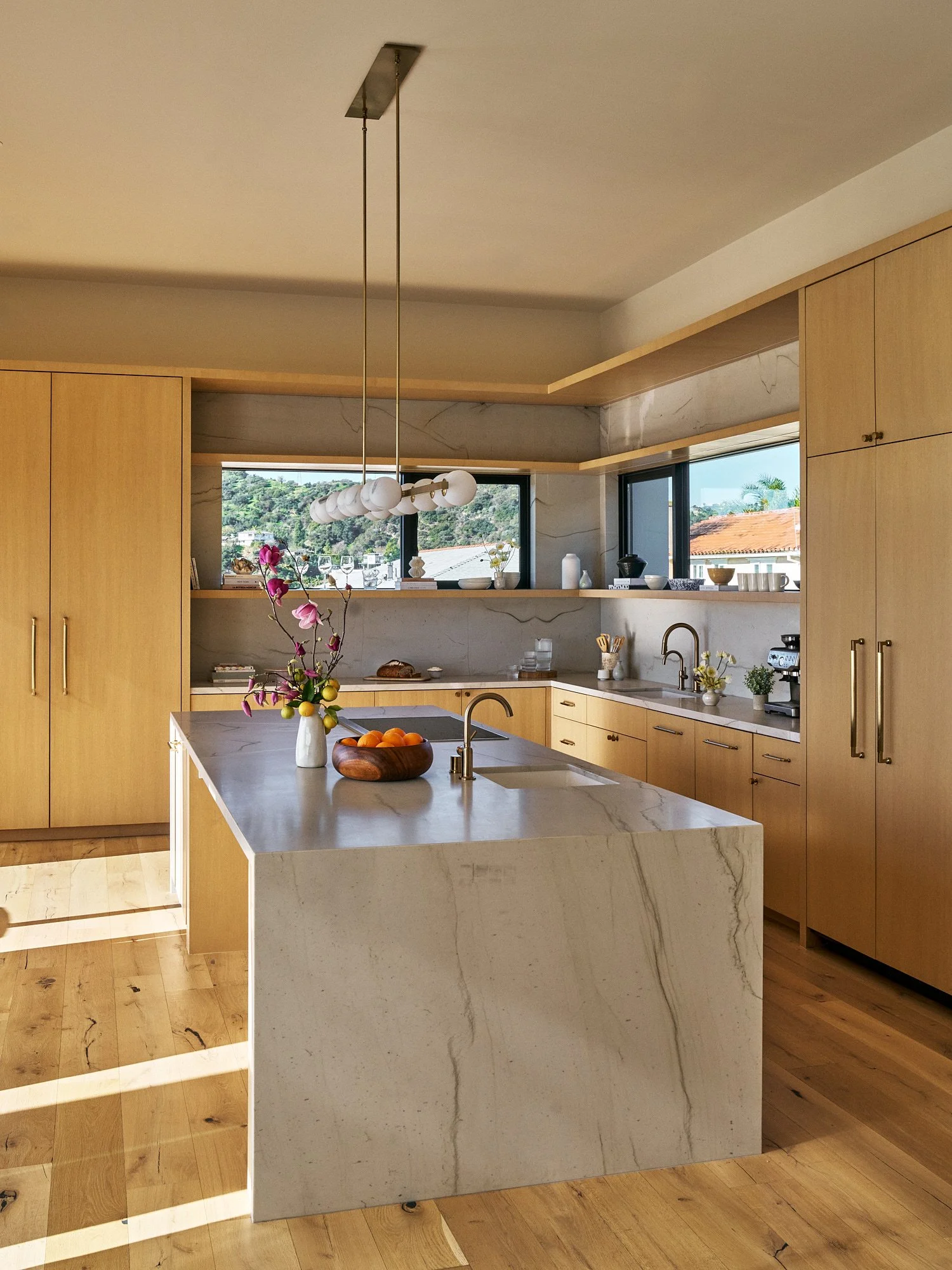 Gray-tone floors were restained for white oak throughout the house, while textured wallpaper and bespoke light fixtures were chosen to add personality. Arched doorways and windows soften the home’s boxy silhouette, and the marble-clad kitchen and bathrooms exude luxury.