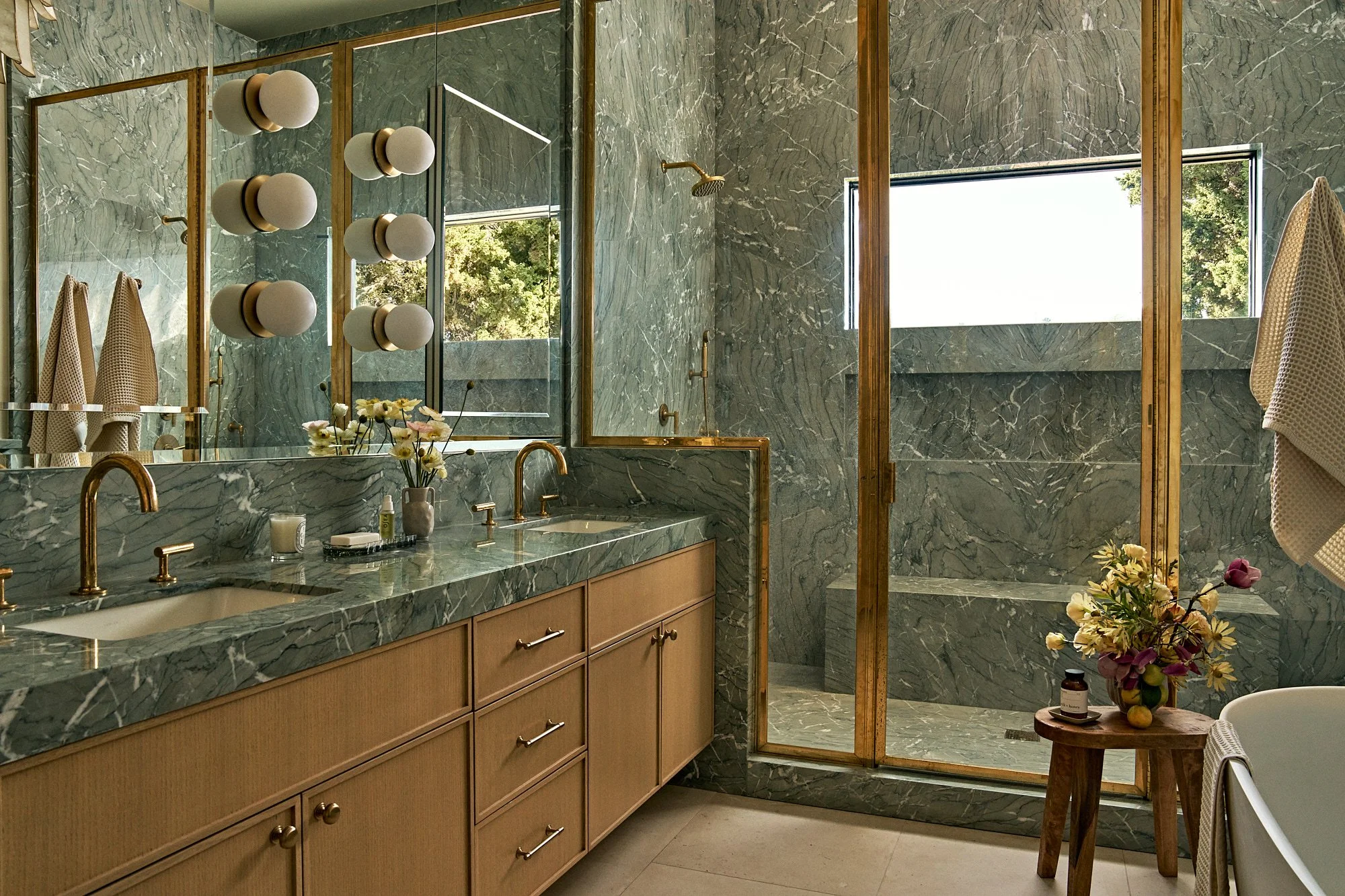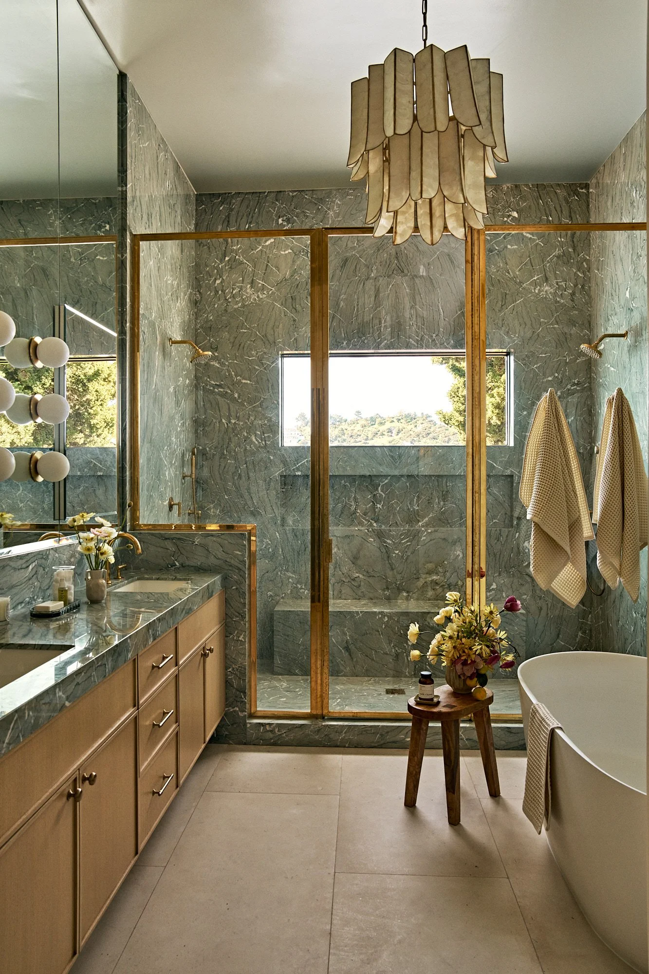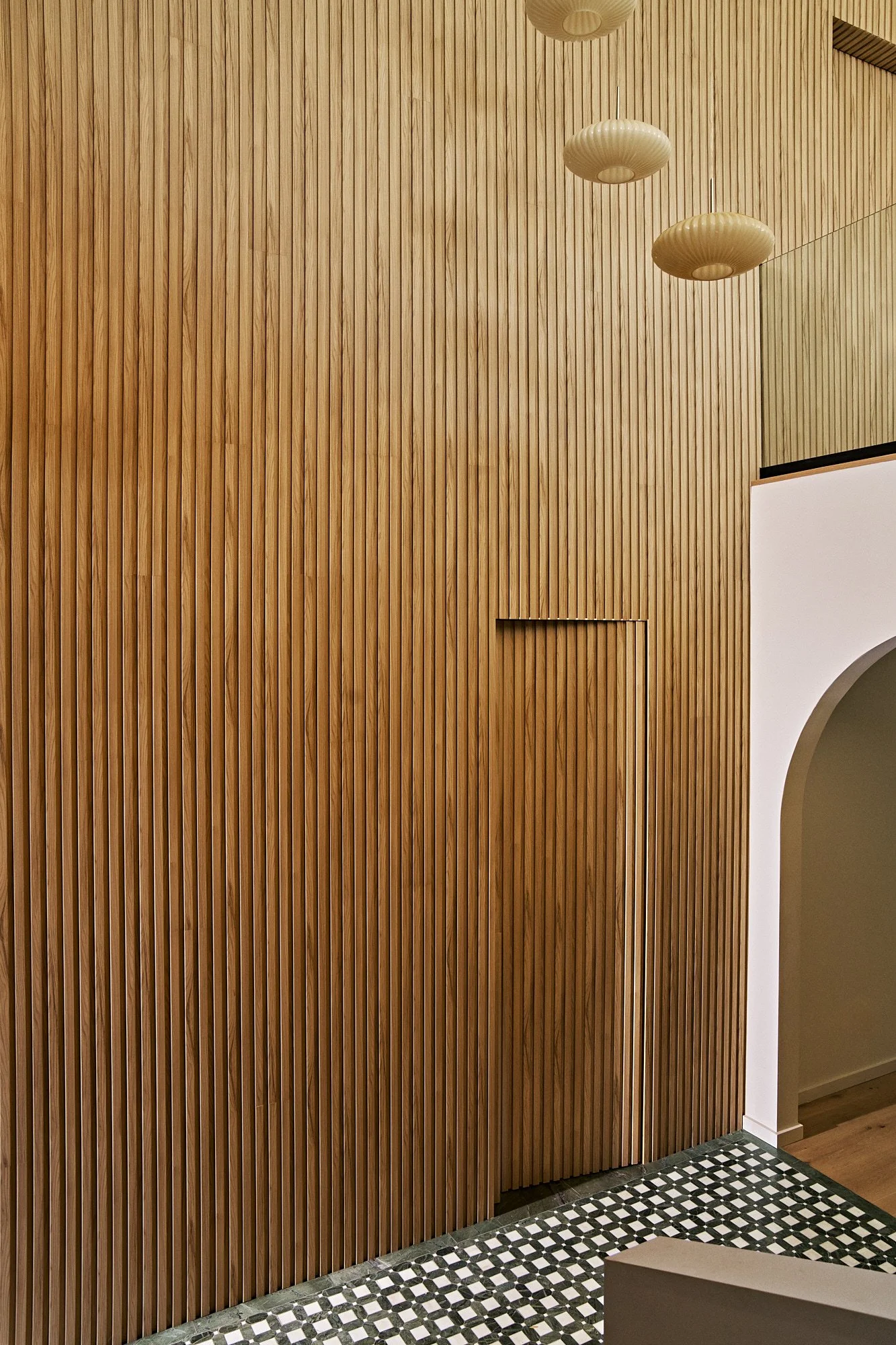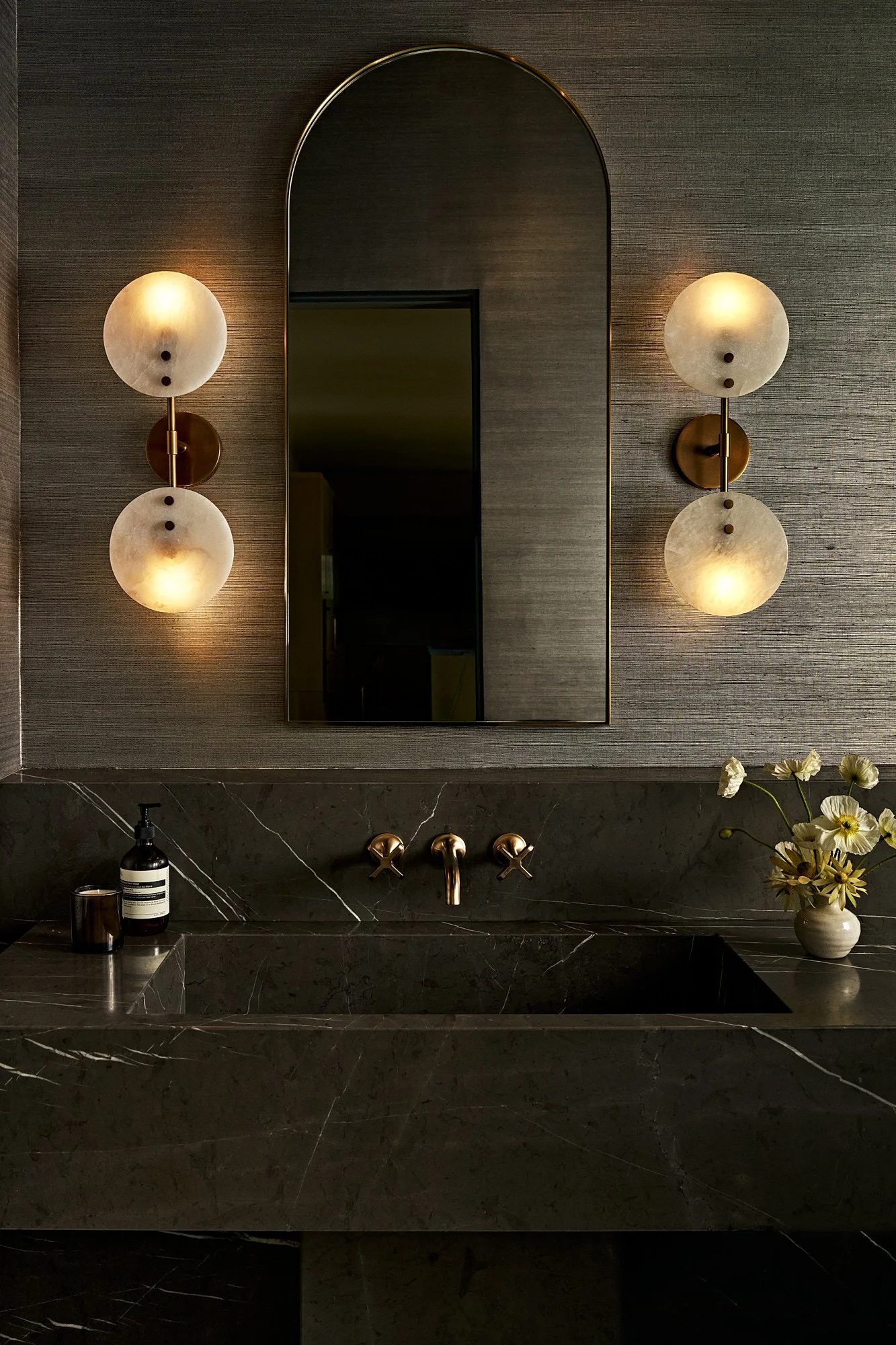 Gray-tone floors were restained for white oak throughout the house, while textured wallpaper and bespoke light fixtures were chosen to add personality. Arched doorways and windows soften the home’s boxy silhouette, and the marble-clad kitchen and bathrooms exude luxury.