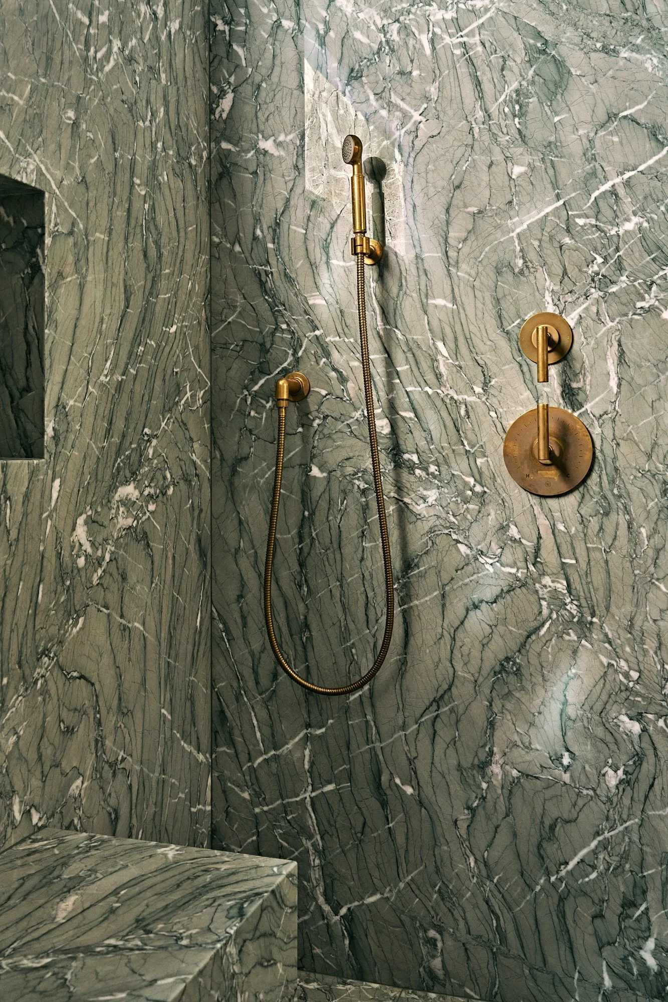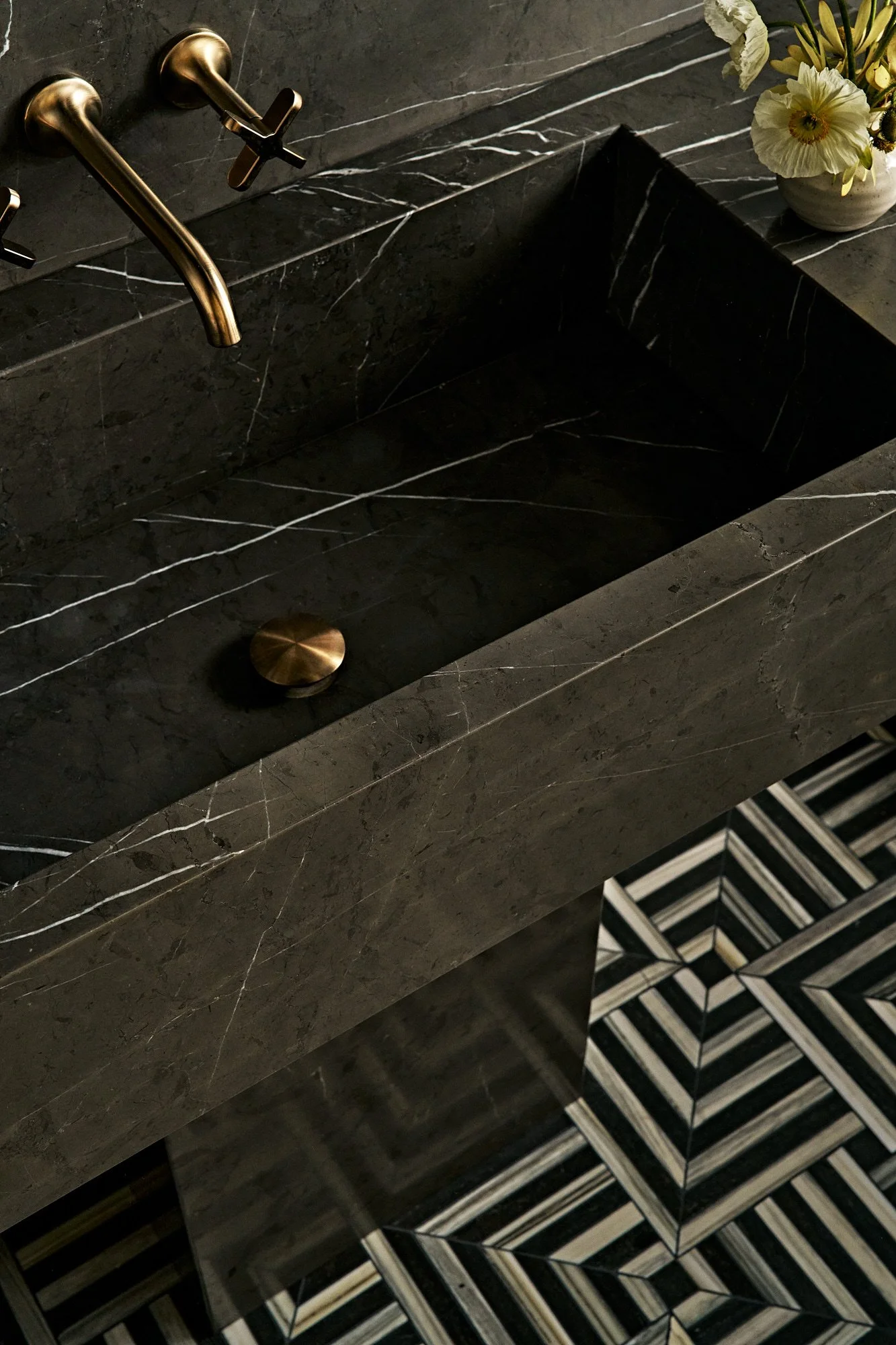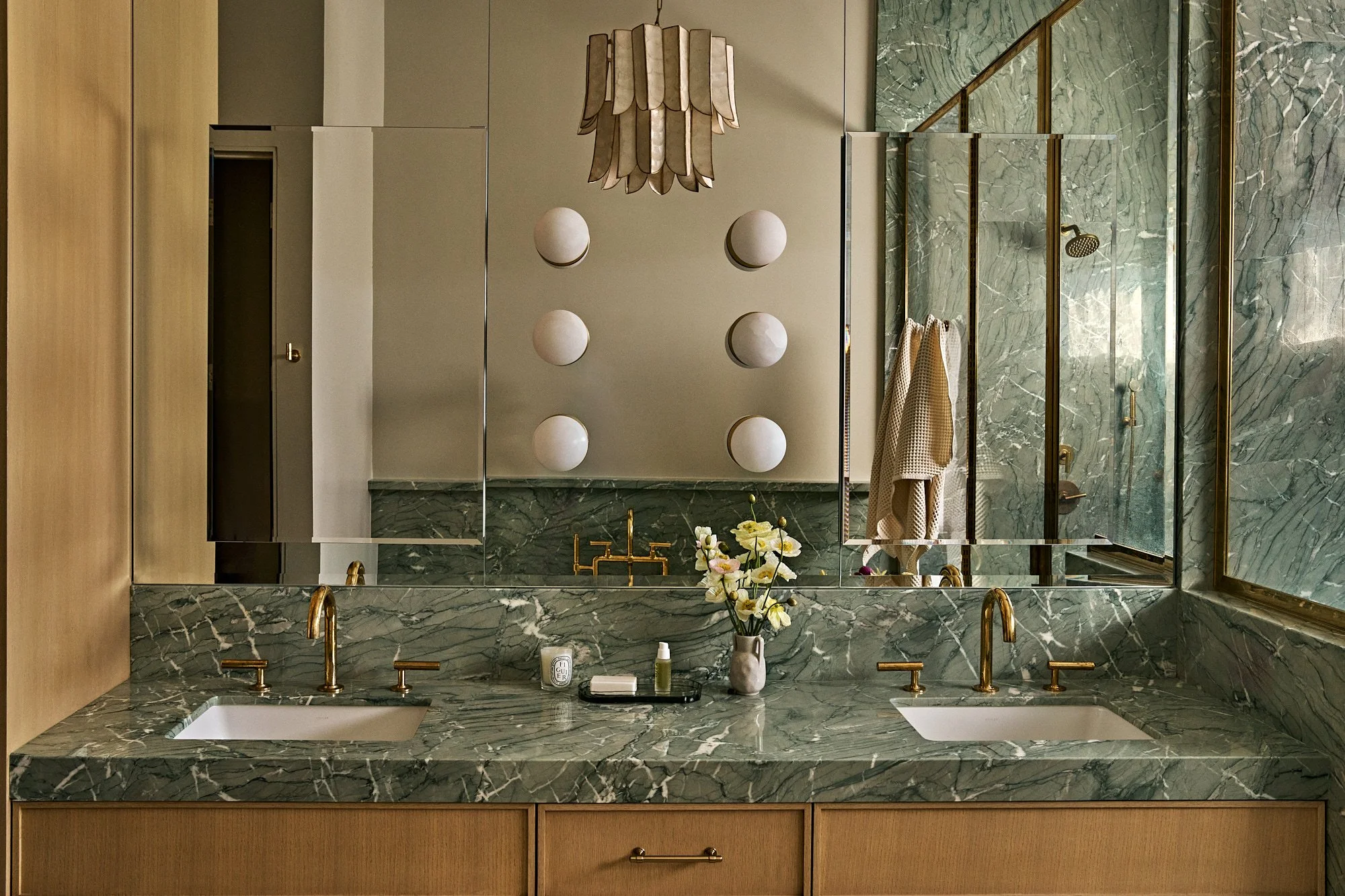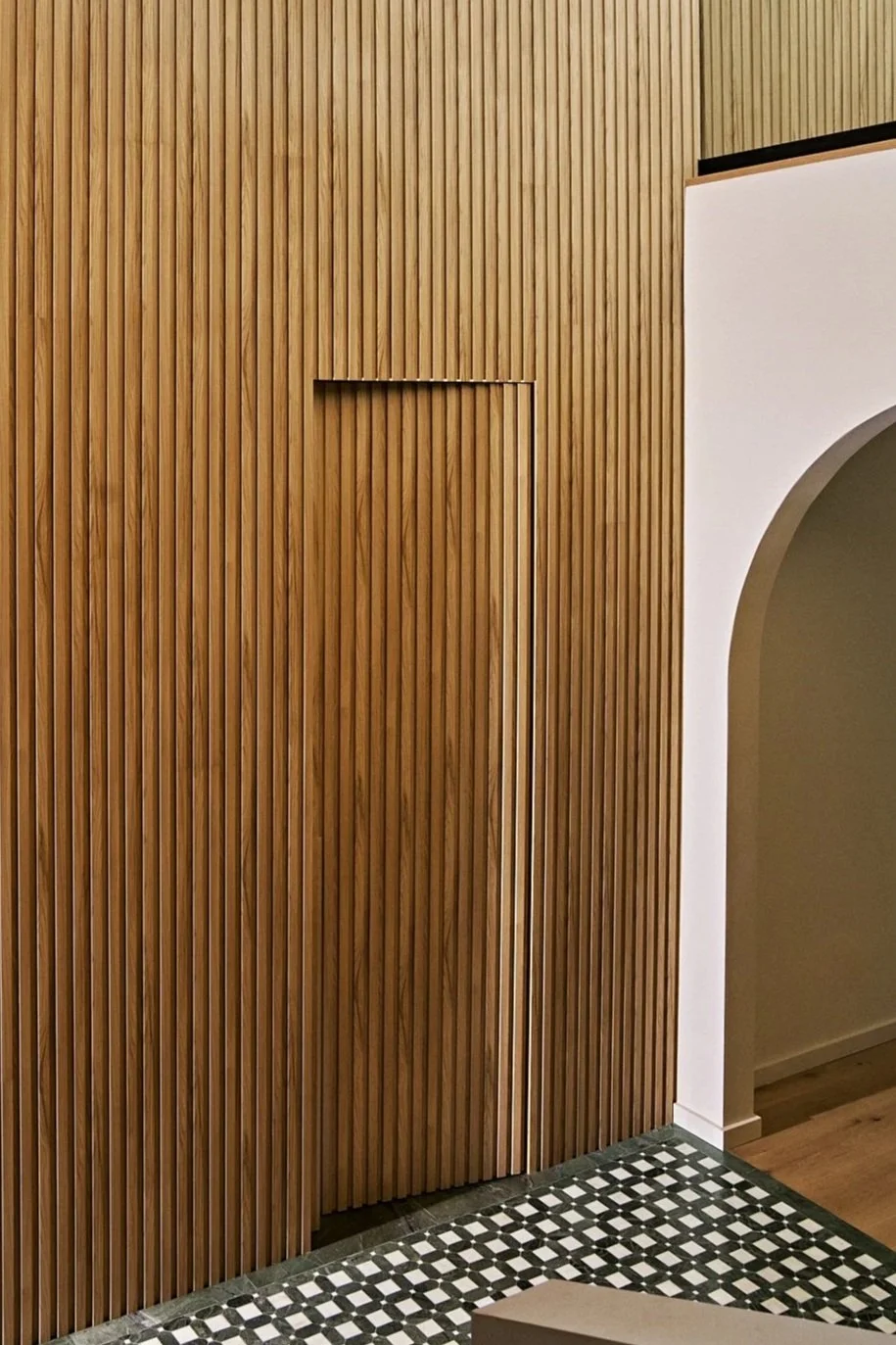 Gray-tone floors were restained for white oak throughout the house, while textured wallpaper and bespoke light fixtures were chosen to add personality. Arched doorways and windows soften the home’s boxy silhouette, and the marble-clad kitchen and bathrooms exude luxury.