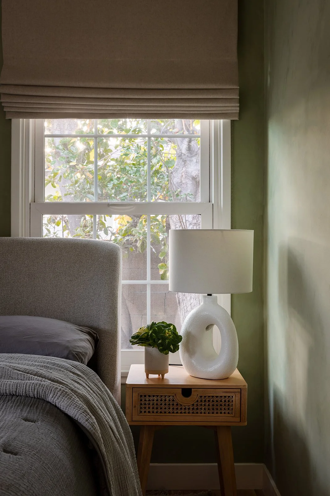 The entryway opens welcoming rattan wallpaper and bold accents that flow into the kitchen and living room. Each of the three bathrooms features natural stone and tile, adding a touch of sophistication. Custom cabinetry and millwork give a modest touch of luxury throughout the house and the built-in bookshelves are a perfect place to showcase their book collection, art, and family memories.
